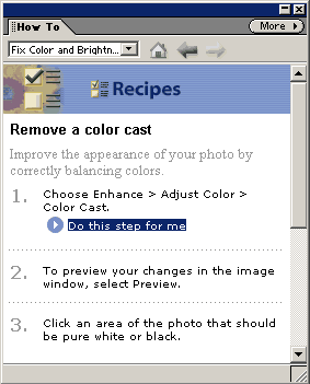 A tím se dostáváme patrně k největsímu rozdílu Elements od Photoshopu - program předpokládá "nizsí odbornost" uzivatele a zřetelně je kladen větsí důraz na nápovědu k jednotlivým funkcím. Pokud navíc uzivatel vůbec neví "kudy kam", můze pouzít novou paletu "How to" (jak na to), která mu krok za krokem pomůze s daným problémem. A to nejen "nápovědou", ale i prakticky. V okně si lze například zvolit nápovědu "odstranění barevného nádechu fotografie" a následně se dočíst, jakým nástrojem barevnost opravit, případně můze uzivatel kliknout na link "Do this step for me" (udělej pro mě tento krok) a Elements vyvolají danou funkci bez nutnosti jejího hledání v menu.