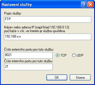 Tlačítkem "Přidat..." si můzeme přidat vlastní port pro přesměrování. "Popis sluzby" je jen nás název, abychom věděli, co přesměrováváme. Takze název "pokus" není moc výstizný. Dalsí, co nastavíme, je IP nebo název PC, kam port přesměrovat. "Číslo externího portu" je na jakém portu bude sluzba viditelná z venčí (v nasem případě 8021). "Číslo interního portu" je port, kam se přesměruje (v nasem případě 21). Jestě označíme, který typ portu se má přesměrovat. Větsina aplikací a sluzeb pracuje na protokolu TCP, tak ho ponecháme. Jen speciální jsou provozovány na protokolu UDP.