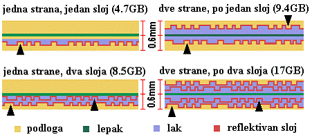 Drugo, DVD specifikacija dozvoljava čitanje informacija sa vise od jednog sloja DVD-a, jednostavno menjajući fokus lasera za čitanje. Umesto korisćenja neprozirnog reflektujućeg sloja, moguće je koristiti jedan proziran sloj sa neprozirnim reflektujućim slojem iza na kome se nalazi jos podataka. Ovo ne udvostručava kapacitet u potpunosti, posto se na drugom sloju ne moze postići gustina kao na prvom, ali omogućuje jednom disku kapacitet od 8,5 GB, bez potrebe za okretanjem istog. Zanimljiva osobina DVD-a je da se njegov drugi sloj moze čitati od unutrasnjosti ka spoljasnjosti, ali i obrnuto.