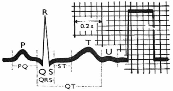 Vlna P sa zapisuje pri depolarizácii predsiení, v úseku PQ sa skrýva začiatok repolarizácie predsiení a predstavuje sírenie vzruchu prevodovou sústavou, závisí od srdcovej frekvencie. Kmit Q je aktivačný negatívny kmit komorového komplexu, kmit R charakterizuje rýchlu depolarizáciu komôr a kmit S je negatívny kmit zaznamenávajúci este depolarizáciu myokardu. Komplex QRS predstavuje sírenie depolarizácie komôr, úsek ST je izoelektrický interval medzi koncom QRS komplexu a začiatkom vlny T. Vlna T je výrazom rozdielneho trvania akčného napätia v jednotlivých vrstvách myokardu. Tvarom je vlna T asymetrická. Úsek ST s vlnou T znamená repolarizáciu komôr. Úsek QT predstavuje elektrickú systolu komôr. Meria sa od začiatku QRS komplexu ku koncu vlny T, závisí od srdcovej frekvencie.