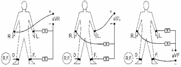 3 unipolárne augmentované (označenie aVR, aVL a aVF) - Goldberg.