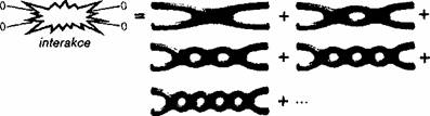 Fyzikální interakce v teorii strun jsou vytvořeny ze základních interakcí mezi vibrujícími strunami. Jak jsme uváděli ke konci 6. kapitoly,* zahrnují tyto interakce rozdělení strun a naopak i jejich spojení jako na obrázku 6.7 (pro pohodlí čtenářů jej opakujeme jako 12.3). Teoretici strun ukázali, jak schematickému zobrazení 12.3 přiřadit matematický vzorec, který vyjadřuje účinek kazdé z přicházejících strun na pohyb ostatních. (Pět teorií se lisí v detailech tohoto vzorce, podobně jemné rysy vsak na chvíli budeme ignorovat.) Kdyby neexistovala kvantová mechanika, popisoval by tento diagram kompletně, jak struny in-teragují. Ale mikroskopické sílenství, diktované principem neurčitosti, umozňuje za vypůjčenou energii vytvořit pár struny a antistruny (tedy dvojici strun vykonávajících opačné vibrace), pokud se energetická půjčka urychleně splatí. Takové páry strun zrozené v kvantové bouři se musí obratem znovu spojit do jediné smyčky, aby dluh splatily, a proto sejmi říká myslené či častěji virtuální páry strun. Jejich existence, byť dočasná, podrobné vlastnosti interakce ovlivňuje.