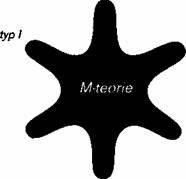 Obrázek 12.2 Výsledky druhé superstrunové revoluce ukázaly, ze kazdá z pěti teorii je částí jediné a sjednocené struktury, prozatím pojmenované "M-teorie".