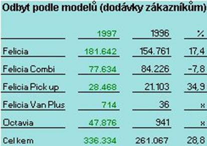 Společnost SKODA AUTO a. s. vyrobila roku 1997 celkem 357.170 vozů. Ve srovnání s předchozím rokem to je zvýsení o 35,7 %.