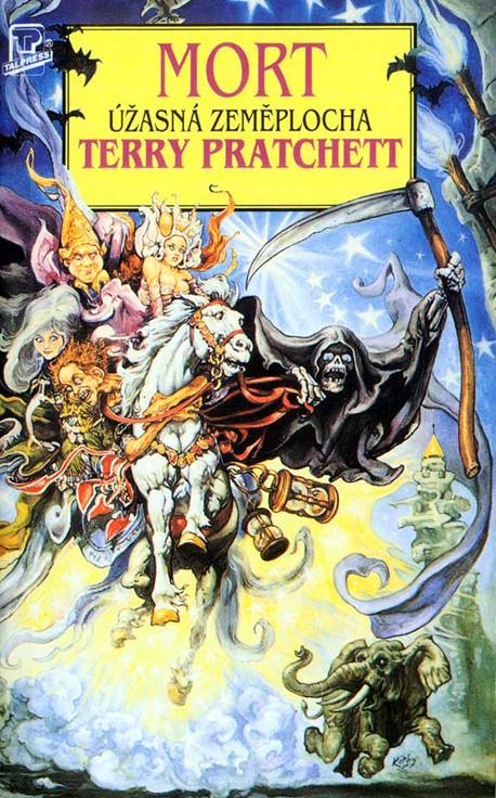 Ale není to Smrť ledajaký. Tohle je Smrť, jehož prostor působnosti není, abychom řekli pravdu, vlastně ani prostor, ale plocha, Zeměplocha, planeta podobná obrovskému talíři. Ten talíř leží na zádech čtyř slonů, kteří stojí na krunýři gigantické vesmírné želvy, Velké A’Tuin, a jeho okraje zdobí bílá pěna krajopádu, jehož vody věčně mizí v hlubinách vesmíru.