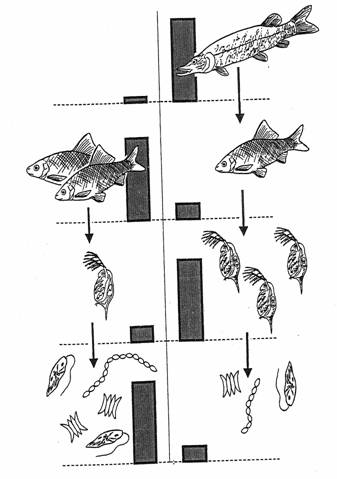 /Obr. provázanost "potravního" (trofic.) řetězce - tj. hustota (mnozství jedinců) jednoho stupně (článku) řetězce ovlivňuje hustotu ostatních.