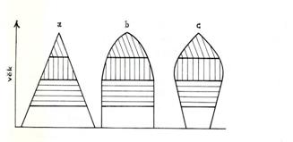 Obr. Věkové pyramidy; a - rozvoj populace (vyssí natalita), b - zdravá populace, c - vymírající populace (vyssí mortalita)
