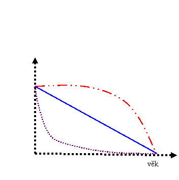 (osa x) čas - "stáří" jednotlivců v populaci (od narození po smrt)