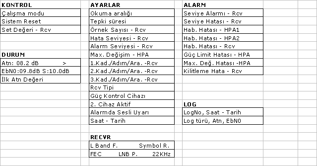 d) Set Değeri -Rcv : Referans alınacak EbN0 değeridir. Cihaz, çalısma sırasında Receiverdan okuduğu EbN0 değerini 'Set değeri'nde tutmak için HPA'in çıkıs gücüne gerekli müdahaleyi yapacaktır.