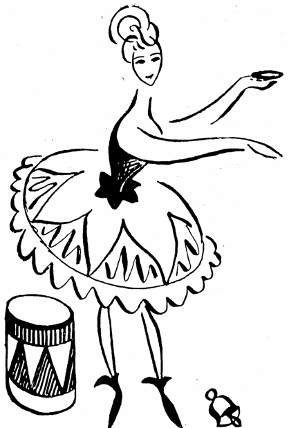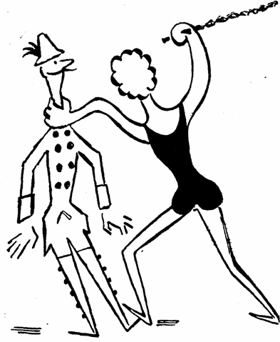 "Mladsí Dohnálková pravila kouzelníkovi, "tančila kdysi v cirkuse ferdinandském s hruskou v ústech. Ně kteří lidé pokládali její vynalézavost za výstřední a opravdu se domnívám, ze jí to nesluselo. Nejvhodnějsí jsou nahá růzová ústa bez ozdob, kdyby vsak nebylo vyhnutí, zvolila bych nikoliv hrusku, nýbrz růzi, jiz drzíme v zubech třenových, zlehka jí pohybujíce."