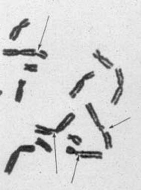 lidských chromozomů poskozených radioaktivním zářením gama. Vady jsou