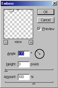 Po objevení textu na obrazovce jej přesuňte na pozadované místo. Přepněte na paletku Channels (Kanály). Zvolte příkaz Select > Save Selection (Výběr > Ulozit výběr). V roletce Document by měl být nastaven název vaseho souboru a pod roletkou Channel polozka New. Pokud tomu tak není, změňte tyto údaje na pozadované. Pojmenujte kanál na Text a klikněte na OK. Poté text odznačte. Tento nově vytvořený kanál zduplikujte (kliknutím na kanál pravým tlačítkem mysi a zvolit Duplicate Channel) a pojmenujte jej Shadow. Tento kanál pouzijete k vytvoření stínu textu. Otevřte dialogové okno Reliéf - Filter > Stylize > Emboss (Filtr > Stylizace > Reliéf), který na tento kanál Shadow aplikujete a nastavte hodnoty na 135 (Angle), 3 (height), 100 (Amount).