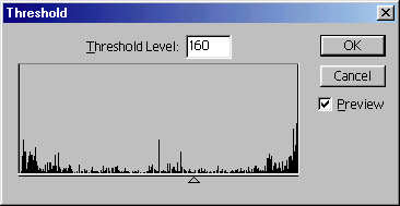 Nyní zduplikujte kanál Shadow stejným způsobem jako jste duplikovali kanál Text a nově vytvořený kanál pojmenujte Light. Tento kanál bude představovat odlesk světla vystouplého textu. Pro převrácení světlých a tmavých oblastí pouzijte Image > Adjust > Ivert (Obraz > Přizpůsobit > Inverze) nebo pouzijte zkratku CTRL-I. Pokud chcete, aby oblasti stínu a světla byly silnějsí, na zvolené kanály Shadow a Light pouzijte příkaz Image > Adjust > Equalize (Obraz > Přizpůsobit > Vyrovnat). Teď musíme oddělit světlou oblast kanálu Light a tmavou oblast u kanálu Shadow. Zvolte kanál Shadow a klikněte na Image > Adjust > Threshold (Obraz > Přizpůsobit > Práh) a nastavte hodnotu v rozmezí 130-255 (v tomto případě pouzita hodnota 160). Poté zvolte kanál Light a postup opakujte.