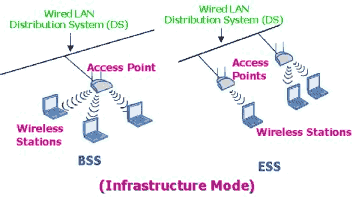 Druhou topologií je Infrastrukturní rezim výstavby sítě, kde koncové bezdrátové stanice přistupují k centrálnímu přístupovému bodu, takzvanému Access Pointu.