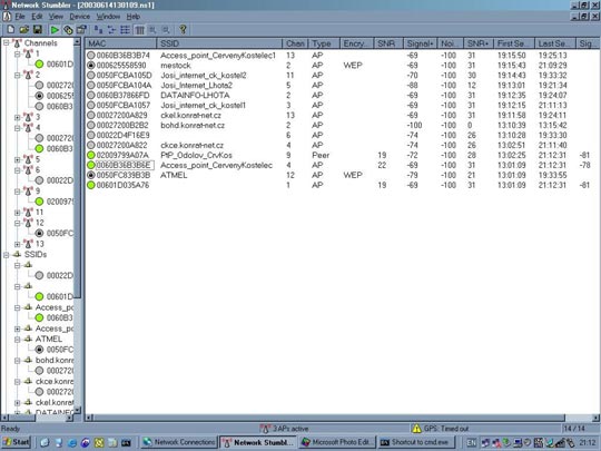 První jsem provedl detekci bezdrátových sítí ve městě. Pro zjistění jejich existence jsem se spoléhal na dvě základní pomůcky. Tou první je, ze větsina AP v pravidelných intervalech, přiblizně 10krát za sekundu, vysílá takzvaný "Beacon". Je to signální rámec obsahující informace o AP včetně identifikátoru obsluhované oblasti (SSID - service set identificator). Pasivním poslechem na vsech dostupných kanálech lze tyto sítě poměrně snadno najít. Je vsak mozné, ze výrobce AP umozňuje potlačit vysílání takovéhoto beaconu či SSID a správce AP této funkce vyuzije. Ale i tak není nic ztraceno. Programem Netstumbler [https://www.netstumbler.org/] provedete nejen snadno a rychle detekci Beacon vysílajících AP, ale program dokáze automaticky vysílat i modifikovaný zkusební rámec, takzvaný "Probe". Vysíláním takového rámce na kazdém kanále způsobíte, ze i "němý" AP, pokud je na daném kanále přítomen, provede svoji identifikaci.