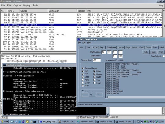 Po přesunu na základnu, ze které je výhled na 1/3 města jsem anténu polozil na okenní rám a zjistil, které bezdrátové sítě jsou bez větsího úsilí k dispozici. Rozhodl jsem se zaměřit na tu síť, která měla největsí signál. Protoze nebyla sifrovaná, přepnul jsem svoji bezdrátovou síťovou kartu bez problémů na kanál, na kterém vybraný AP (Acces Point) komunikoval. Poté jsem freeware snifferem Ethereal verze 0.9.13a [https://www.ethereal.com/] provedl odchycení asi třech tisíc paketů na síti. Tyto pakety mi umoznily si vytvořit rámcovou představu, jakou IP adresaci síť pouzívá, jaká je adresa DNS serveru, SMTP a také informace o některých stanicích na síti. Zvolil jsem si jednu z neobsazených IP adres a vyzkousel se k AP připojit. Bohuzel, spojení se nezdařilo, AP mi nepřiděloval "Assotiation ID", které je potřebné k vlastnímu navázání komunikace. Toto bylo způsobené pravděpodobně tím, ze testované AP pouzívá k ochraně přístupu seznam autorizovaných MAC adres.