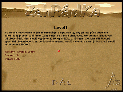 Po zmáčknutí tlačítka nová hra se vám objeví dialog kde je napsáno, co máte dělat v daném kole, jaké rostliny můzete pěstovat, kolik peněz musíte mít a jestli jde stavit studna a zavlazovací systém.