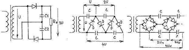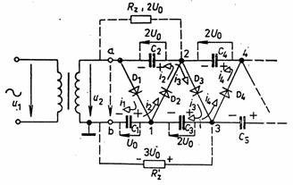 Násobiče napětí se pouzívají pro získání napětí řádu stovek voltů az několik jednotek kilovoltů. Jsou určeny pro odběr malých proudů - maximálně několik desítek mA. Činnost tzv. kaskádního násobiče napětí je následující: působí-li v bodě a kladná půlvlna, je otevřena dioda D1 a nabíjí se kondenzátor C1 na napětí U0. Ve druhé půlvlně je otevřena dioda D2 nabíjí se kondenzátor C2 na součtové napětí kondenzátoru C1 a transformátoru, neboť tyto jsou zapojeny v sérii. V dalsí kladné půlvlně se jednak otevírá dioda D1 a dobíjí se kondenzátor C1 a jednak se otevírá dioda D3 a nabíjí se kondenzátor C3 na napětí 2U0. V následující půlperiodě se otevírají diody D2 a D4, nabíjí se kondenzátory C2 a C4, atd. Popsaný postup nepůsobí v skutečnosti postupně, jak je naznačeno, ale najednou, tzn. ze při kladné půlvlně v bodě a se otevírají vsechny "liché" diody a nabíjejí se vsechny "liché" kondenzátory, v záporné půlvlně se pak otevírají "sudé" diody a nabíjejí se "sudé" kondenzátory.