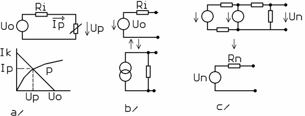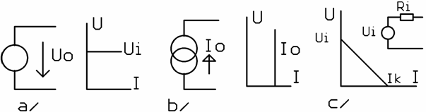 Vývody stejnosměrného zdroje označujeme + a - . Technický směr proudu byl dříve zaveden od + k -. K později se zjistilo, ze směr pohybu elektronů, které jsou nositeli proudu je opačný. Při řesení obvodů pouzíváme ideální zdroje. Ideální zdroj napětí dává konstantní napětí bez ohledu na velikost odebíraného proudu. U skutečného zdroje dochází vzdy při odběru proudu k poklesu svorkového napětí. Napětí zdroje naprázdno nazýváme vnitřní napětí zdroje Ui. V sérii s tímto zdrojem je vnitřní odpor zdroje Ri.