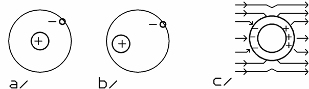 Obrázek Polarizace a/ atom nepolarizovaného dielektrika b/ polarizovaného dielektrika c/ princip stínění