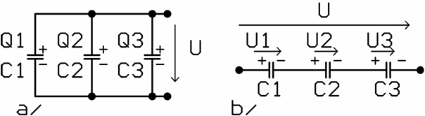 Obrázek Zapojení kondenzátorů a/ paralelní b/ sériové