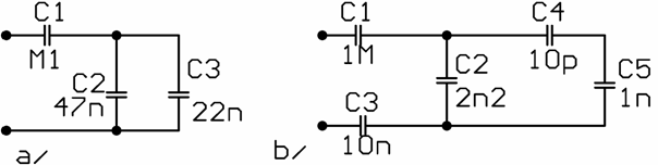 Tolerance vyráběných kapacit bývá typicky ±20%. Při zjednodusování obvodů nemá smysl počítat s přílis velkou přesností. Zapojení z obr.b můzeme zjednodusit vynecháním C4 a C5 (jejich sériové spojení má kapacitu mnohem mensí, nez je kapacita C2) a zkratováním C1 (jeho kapacita je mnohem větsí nez ostatní kapacity), můzeme je tedy zanedbat. Výsledná kapacita bude přiblizně C = C2 C3/(C2+C3) = 10 . 2,2/(10+2.2) = 1,8 nF.