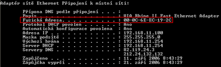 MAC je unikátní "podpis" síťového prvku a... vstup do hackinguUz dříve bylo pozadavkem správců síti to, aby kazdá prvek sítě LAN měl své vlastní jedinečné a neměnilelné* číslo přidělené uz v průběhu výroby. Důvodem je zvýsení bezpečnosti počítačových sítí - některé sluzby kontrolují nejen IP adresu cílového zařízení, ale i dodatečný hardwarový identifikátor zařízení sítě Ethernet, takzvanou MAC adresu (často nazýván fyzickou adresou zařízení). MAC adresa bývá některými poskytovateli internetu pouzita pro identifikaci a tím zpřístupnění internetu (např. UPC), proto je dobré vědět, jak ji zjistit. Postup je jednoduchý - otevřete příkazový řádek ("Start" > "Spustit", do pole napiste cmd a stiskněte "OK"). Do příkazového řádku napiste příkaz: IPconfig /all a na obrazovce se vypísí vlastnosti vsech síťových adaptérů v počítači. Vasi MAC adresu najdete v řádku Fyzická adresa (viz. obrázek).