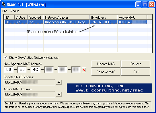 Vyřesil jsem jej nainstalováním utility SMAC, která dokáze změnit MAC adresu síťové karty počítače v prostředí Windows. Hardwarová adresa MAC zůstává, systém vsak "navenek" hlásí takovou MAC adresu, jakou nastavíte v programu (Spoofed MAC se změní po restartu). Pouze díky tomu nemusím volat na dispečink a hlásit stále změnu MAC adresy - vsude jsem nastavil "schválenou" MAC adresu, i kdyz původní počítač s touto adresou je nejspíse uz v jiné části republiky... |