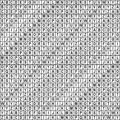 V jednom jejím pouzítí postupoval při sifrování tak, ze první písmeno textu zasifroval pomocí prvního řádku, druhé pomocí druhého atd. Po pouzití posledního řádku pouzil znovu první řádek (zanedbáváme diakritiku):