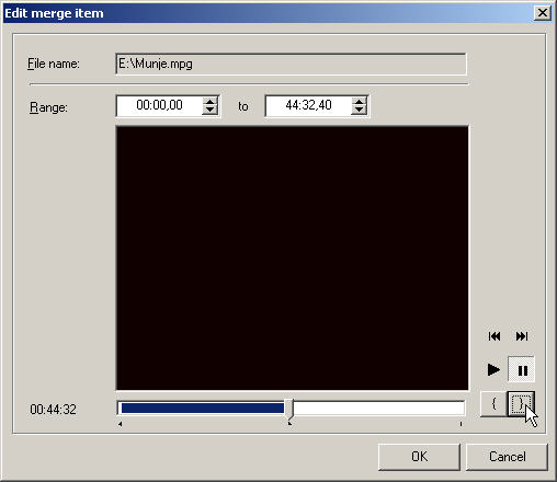 Sada ides na rez za drugi deo, ponavljas korake za rezanje kao u prvom delu, izmena je kao na slici dole- potenciometar povlačis na mesto prethodnog reza, i sada kliknes na levu zagradu, sad je markirana plavo druga polovina filma: