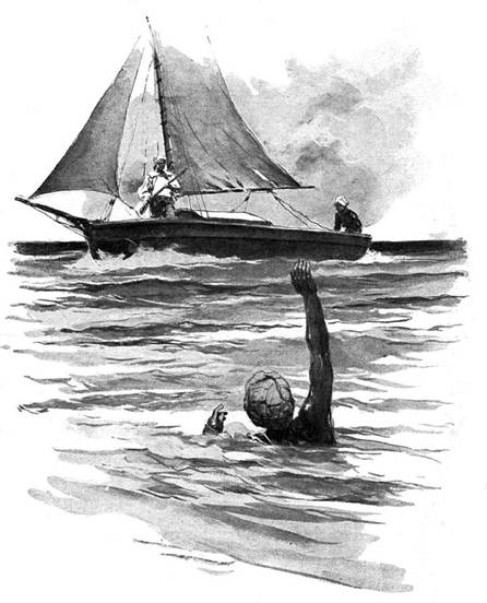 Člun sbíral vítr vsemi třemi plachtami, ale za hodinu jsme si s lítostí uvědomili, ze loď odpluje z dohledu dříve, nez se mi podaří dáti jí znamení. Nicméně chtěl jsem tento závod rozhodnouti pro sebe vsemi prostředky mořeplavecké dovednosti. Ale vse se zdálo marné. Kdyz se mne za dalsí hodinu marného běhu za tou jedinečnou přílezitostí zmocňovalo zoufalství, stal se opět jeden z těch zázraků, které vpravdě zázrakem nejsou, poněvadz jimi osud odměňuje vytrvalé úsilí a přičinlivost.