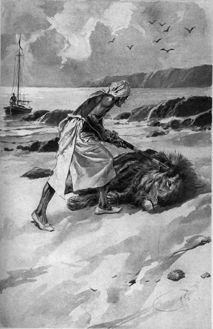 Loveckou kořist jsme tedy měli, ale nasytit jsme se jí nemohli. Litoval jsem, ze jsme promarnili tři náboje a tolik střeliva na tvora, který nám neposlouzil. Xury vsak se zatvářil tajemně a prohlásil, ze si kousek lva vezme pro stěstí. Vrátil se na palubu pro sekeru. Na otázku, proč chce sekeru, odpověděl: "Uříznout hlavu." Ohromnou hlavu samozřejmě se mu nepodařilo utít, ale jednu tlapu přece jen přinesl. Viděl jsem, jak je velká.