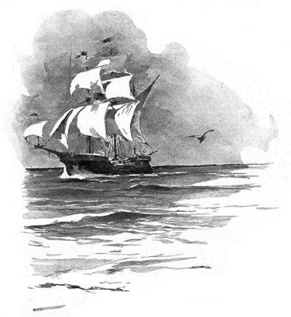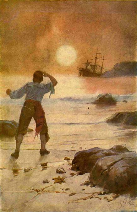 Jda do kajuty a uvazuji, jak se dostati z rozporu a nejistoty. Usedám a podpírám hlavu dlaněmi. Najednou za mnou přibíhá Xury a křičí: "Loď, pane! Loď s plachtou! Mnoho plachet, velké plachty!"