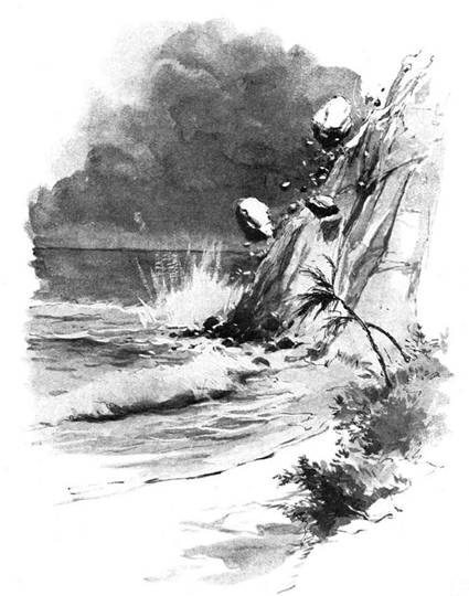 Přistáli jsme několikrát, abychom vystoupili na břeh a nabrali pitné vody, a tak jsme jednou ráno kotvili pod malým, ale značně vysokým skalním výbězkem. Nastával právě příliv a čekali jsme na vhodnou chvíli, kdy se nám podaří vystoupit na zemi. Xury měl bystřejsí zrak nez já a vsímal si také více svého okolí. Najednou přisel ke mně a poseptal mi, ze bychom měli raději plouti dále od břehu; řekl: "Jen se podívejte pod tamto skalisko - a ukazoval rukou - vidíte tam lezet to velké zvíře? Myslím, ze zrovna spí."