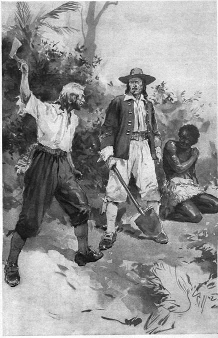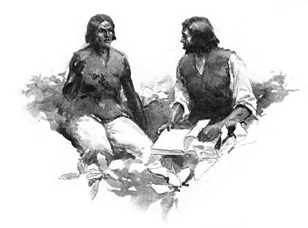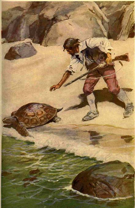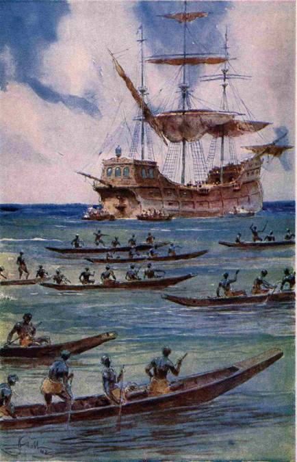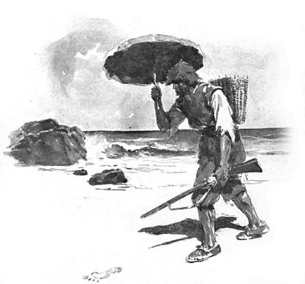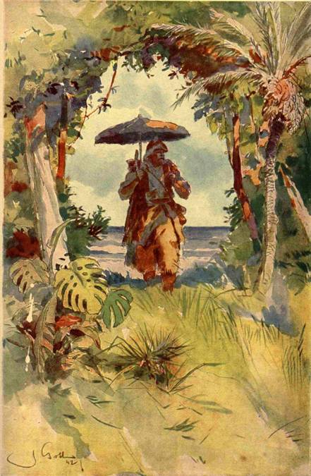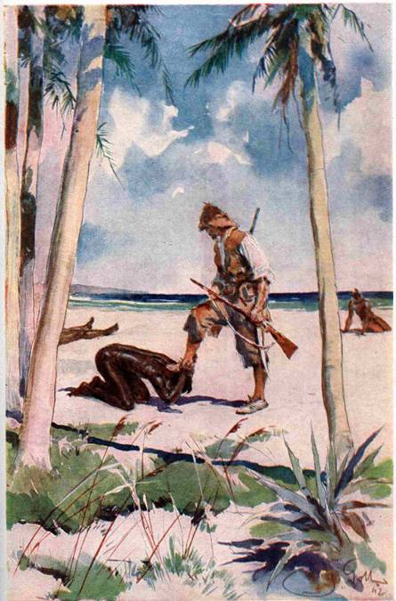 Chtěl jsem přistáti a vystoupit na břeh, ale Xury mi radil k opatrnosti, řka: "Ne, nechodit, nechodit!" Přesto jsem kormidloval ke břehu, abych mohl hovořiti s domorodci, kteří bězeli jiz značný kus cesty za člunem.