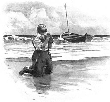Kormidelník a několik vnímavějsích námořníků nabyli jistoty, ze vsichni zemřeme; proto klekli na palubu a hlasitě se modlili.