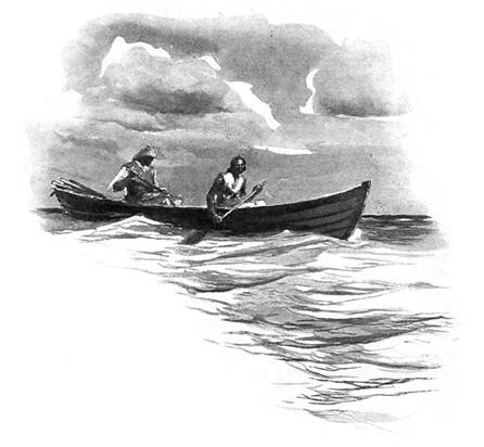 Jednou ráno jsme se vydali opět na lov. Nad pobřezím lezela tak hustá mlha, ze jsme neviděli ani na břeh, ačkoli jsme se nevzdálili ani půl míle od pevniny. Vracejíce se s úlovkem, veslovali jsme podle svého přesvědčení ke břehu, ale země se nepřiblizovala. Nevěděli jsme, kam plujeme. Strávili jsme celý den i celou přístí noc na moři, a kdyz se ráno rozednilo, shledali jsme, ze jsme pluli stále podél pobřezí, od něhoz jsme se nevzdálili ani na dvě míle. Vyhladovělí a vyčerpáni dostali jsme se proti prudkému větru, který vanul s pevniny, do jakési zátoky, kde jsme přistáli.