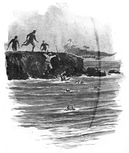 Vynořil se ihned, poněvadz uměl plovati jako korek, a křičel, abych ho vytáhl, slibuje, ze se mnou půjde na konec světa. Ploval tak rychle za člunem, ze by mne byl málem dohonil, jezto nastalo bezvětří a loďka se sunula velmi pomalu po hladině. Dosel jsem do kabiny pro pusku a namířil na Maura. Pak jsem volal: "Nekřič a neublízím ti! Ploves dobře, moře je klidné a snadno se dostanes na břeh; jsou to jen dvě míle! Chci na svobodu, a jakmile se přiblízís k člunu, vpálím ti kulku do hlavy!"