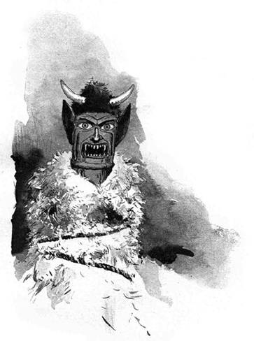 Klusal jsem k dřevěnému netvoru a rozťal mu mečem čapku na hlavě, takze se mu smekla po jednom z rohů. Můj průvodce uchopil ovčí kůzi, anebo chcete-li, oděv té modly, a chtěl ji strhnouti bohovi s těla. Ale tu najednou se rozlehl vesnicí hrozný pokřik, z chat a kozených stanů se vyhrnulo na tři sta lidí, vyjících zuřivým hněvem, a vsichni bězeli k nám. Mnozí měli luky a sípy. Vzali jsme tedy bez rozmýslení nohy na ramena, ale umínil jsem si, ze tu modlu navstívím jestě jednou.
