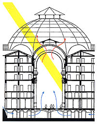In moderate climate-zones there is a need for heating in the winter period, while in the summer cooling of the buildings is necessary. For a long time mechanical installations were used to achieve this. But these use too much energy and moreover, they require hermetically closed buildings to work well. However it is possible to naturally cool or heat buildings by using a conservatory or atrium.