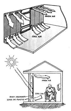 The principle of thermosiphoning - the natural buoyancy of heated air or water is used to circulate heat - in a Trombe-wall is an example of a soft-technology approach to solar heating. With this technique, developed in the sixties under the direction of Professor Felix Trombe at the Centre National de la Recherche Scientifique in Odeillo (France), sunlight is absorbed on an external dark-coloured surface protected by a glazing system. The technique provides winter space heating and can be used to draw cool air through the house in the hot season.