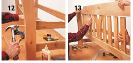 15. Place the upper rail over the upper ends of the slats, beginning at one end, and easing the slats into the dado of the upper rail. A second pair of hands can be useful here in order to keep one end of the upper rail secure as you work your way along the slats to the other end. Be sure the slats are completely seated in the dado before proceeding.