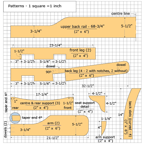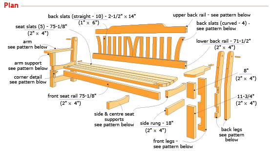 what you'll need materials . 8 pcs. 2" x 4" x 8' frame and seat boards . 1 pc. 2" x 6" x 10' back and arms . 1 pc. 2" x 6" x 12' rear legs . 2 pcs. 1" x 6" x 5' back slats . 1/2" hardwood dowel 4ft length: 2624-271 . 3/8" hardwood dowel 4 ft: 2624-235 . 2-1/2" deck screws 2182-989 . 1-1/2" galvanized finishing nails 2134-826 . waterproof glue 2020-850/869 . stain or wood sealer CWF-UV clear 1877-838 . 4 wooden buttons to cover 1/2" drilled holes 8296-500 Note: The true measurement of 2" x 4" stock is actually 1-1/2" x 3-1/2". tools . compound mitre saw or circular saw 1265-222 . building square 1070-067/085 . drill, bits, #8 countersink and driver 1227-915 . 1/2" wood boring spur bit 1214-377 . 3/8" wood boring spur bit 1214-359 . clamps 1022-930-985 . hammer 1030-556 . measuring tape 1048-832 . jigsaw 1268-666/700 . sander, belt or orbital 1262-333/859 . router, 1258-347 and rounding-over or ogee bit (optional) 1215-189 . routing flush trim bit (optional) 1288-332 . 7" dado blade 1346-056 |