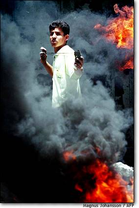 A Palestinian youth uses a slingshot to fire stones at Israeli soldiers from