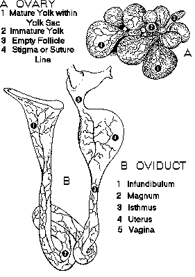 The oviduct is a large, coiled tube located in the left side of the abdominal cavity. In this oviduct, all parts of the egg, except the yolk, are formed. It is divided into five distinct regions: (1) infundibulum or funnel, (2) magnum, (3) isthmus, (4) uterus or shell gland, and (5) vagina.