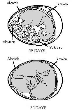 At the end of the third day of incubation, the beak begins developing and limb buds for the wings and legs are seen. Three visceral clefts (gills) have formed on each side of the head and neck. These formations are important in the development of the arterial system, eustachian tube (in the ear), face, jaw, and some ductless glands. The fluid-filled amnion has surrounded the embryo to protect it: it helps maintain proper embryonic development. The tail appears, and the allantois is seen. The allantoic vesicle is a respiratory and excretory organ. Nourishment from the albumen and calcium from the shell are transported to the embryo through the allantois.