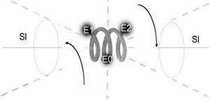 B - during the coiling of the right spiral the rotation of E1 and E2 elements with respect to the central area of the spiral (E0) occurs in the opposite direction than during the uncoiling, and in this case the space in both external cones polarizes creating the left torsion field.