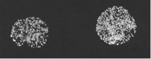 It is very likely that definite rotation movements associated with the unwinding and winding of DNA helix structures occurs as well during the genes transcription, although they evidently do not play a decisive role in the formation of a cell field.It should be stated that the process of replication as well as other processes in the cell are highly ordered and repetitive. As it is shown on the Xenopus (frog) eggs extracts in the work [7], eukaryotes experience the formation of compound protein complexes, so-called pre-replication centers (Fig. 3), immediately after the completion of division and the beginning of nucleus formation. Later they transform into replication centers, which define places of chromosome DNA fastening in a cell nucleus and in essence fulfill the replication in the S-period of interphase. There is logic in the supposition that replication centers are situated in a nucleus according to the law, and their oscillation has a species-specific character. In this way one can define a specific peculiarity of a configuration of generated torsion fields, in other words, specificity of the biological field of a given type of a cell, tissue, and species.