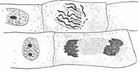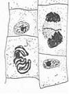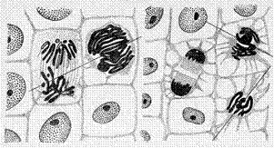 The work examined interaction between mitotic figures of dividing cells in cerebral vesicles of the triton and axolotl as well as during mitosis in onion rootlets and larch spores. It was found that during mitosis in neighbor cells and on conditions that the axis of a mitotic figure of one cell crosses the axis of chromosome figure in another cell, this causes the deformation of the latter (Fig. 7). Moreover, it was proved that these were the interactions between the chromosomes that caused the observed influence, and they were not at all connected with the change of turgor pressure in neighbor cells, etc.