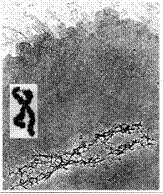 Only histons were removed from the chromosome. Scaffolds are clearly seen among chromatin threads. An uncoiled chromosome is shown on the insertion. Scale (below) - 2 mm.